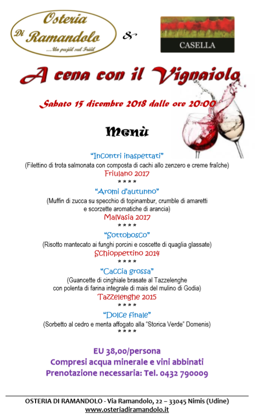 Sabato 15 dicembre dalle ore 22.00, all'"Osteria di Ramandolo" in Via Ramandolo, 22 a Nimis, siete invitati alla Cena con il Vignaiolo. Un gustoso menù accompagnato dai nostri vini.